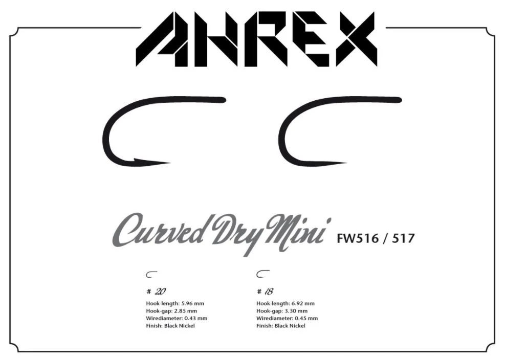 De Ahrex FW516 Curved Dry Mini heeft hetzelfde ontwerp als de Curved Dry Hook van Ahrex, maar met een wat ruimere haakbocht. De FW516 biedt hiermee betere kansen op het haken van een vis, bij het vissen met kleine droge vliegen.