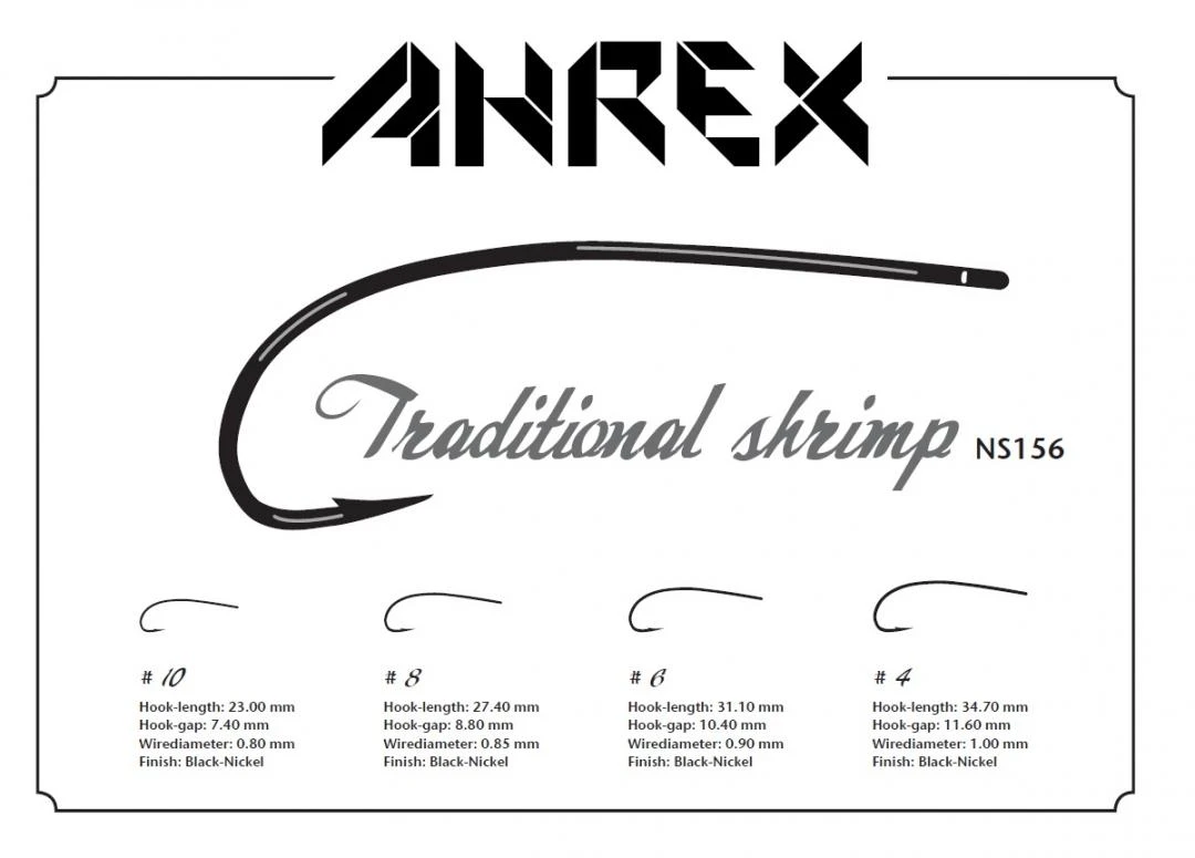 Voor veel vliegenbinders is de Ahrex NS156 Traditional Shrimp Hook de juiste haak om te gebruiken voor garnalenpatronen. De mooie ronding van de haaksteel bootst de ronding van een natuurlijke garnaal op een fraaie manier na. Merk op dat de punt van de NS156 haak iets naar boven staat voor een beter inhakingsvermogen.