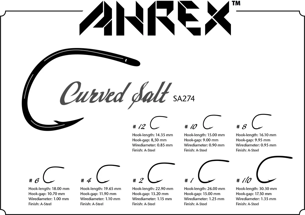 De Ahrex SA274 Curved Salt Hooks zijn uitgevoerd met een korte haaksteel, ze kunnen met hun superwijde haakopening gebruikt worden voor prooivisimitaties of als voorste haak op Game Changers. De SA274 heeft hetzelfde ontwerp als de NS172 van Ahrex, maar deze haak is iets zwaarder en is gecoat met de A-Steel finish.