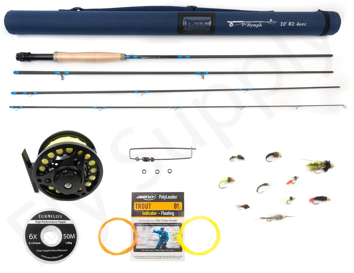 Deze set bevat een Euro Flies hengel, Large Arbour reel, drijvende level nymph lijn, Vision Backing, Twee Airflo Nymph Leaders, 10 Tippet Rings, Euro Flies Tippet en 10 van de meest populaire nimfen. Om de set helemaal compleet te maken zit er ook een harde cordura koker bij om de hengel in op te bergen.