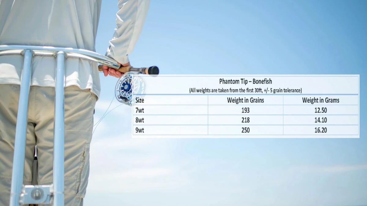 All Phantom Tip – Bonefish lines are weighted on the heavy side of the true AFFTA standards. You can see the weight ranges in the chart pictured here (weights are measured from the first 30 ft of the head). Many fly lines in today’s market are vastly over-weighted, sometimes up to 3 sizes. At Monic, we understand that not every angler is using a fast action rod or wants an ultra-heavy fly line forced into their hands. That is why we want to leave the decision up to you. After all, nobody knows your rod and fishing style better than you do.