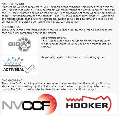 Het G-Spool ontwerp transformeert jouw Nautilus NV-G Serie vliegenreels in super arbour vliegenreels die lijn sneller oppakken dan elke andere vergelijkbare reel in de markt. Het G-Spool (Giga Spool) ontwerp vermindert het gewicht van de reel aanzienlijk en zorgt voor minder kringelen van de vliegenlijn en een veel snellere lijnopname (tot 15 inch/38 cm per draai van het handvat op de G-10!).