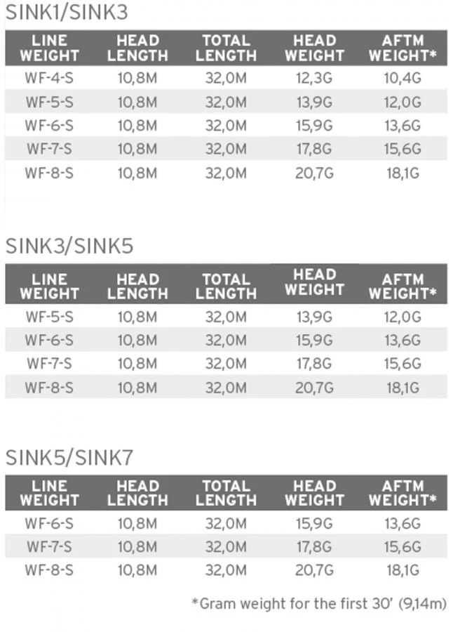 - Sink 5/Sink 7: De snelst zinkende SD vliegenlijn, met een Sink 5 volglijn en een Sink 7 (7,0 ips/17,8 cm) buik, hiermee kun je echt de bodem afzoeken