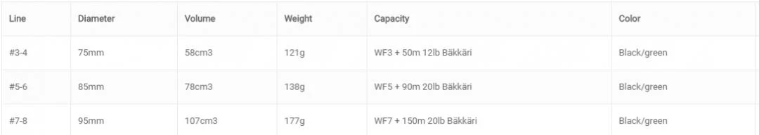 Het grootste model kan met gemak een #10 Big Daddy vliegenlijn en 50 meter 30 lb backing bevatten, wat het een geschikt stukje gereedschap maakt voor de jagers op grote snoek.