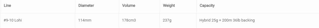 De spoel van de vliegenreel heeft genoeg lijncapaciteit voor zware schietkoplijn-systemen of lijnklasse #10 – 12 zoutwater vliegenlijnen, dit inclusief een grote hoeveelheid backing.